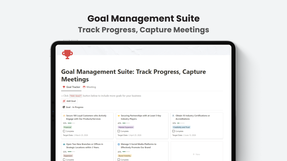 Don't let goals slip through the cracks or meeting details get lost. Grab the Goal Management Suite and experience the difference a streamlined system can make.