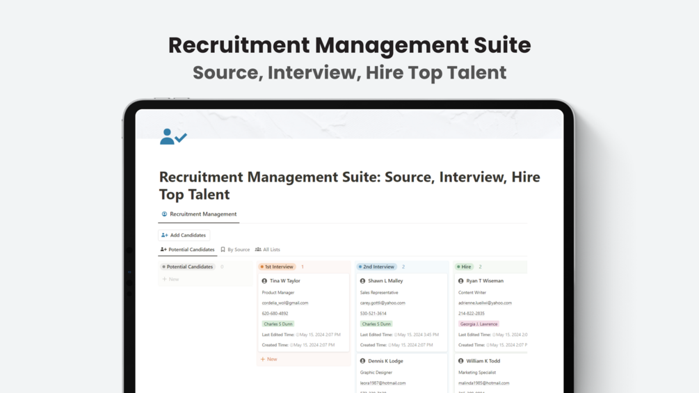 The Recruitment Management Suite is your comprehensive solution for attracting, evaluating, and onboarding the best candidates for your team. This Notion template simplifies every stage of the hiring journey, from initial sourcing to final offer letters.